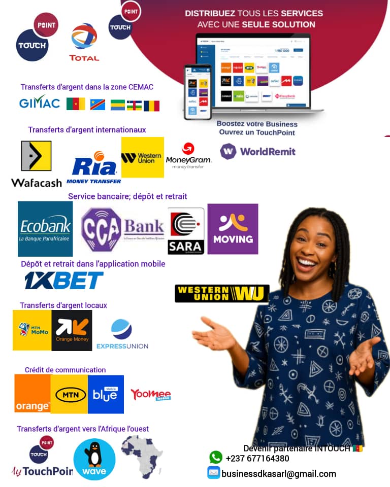 Nous avons le plaisir de vous proposer une opportunité stratégique de partenariat avec notre plateforme multimodale INTOUCH, spécialisée dans les transferts d'argent à l'échelle nationaux et internationaux.